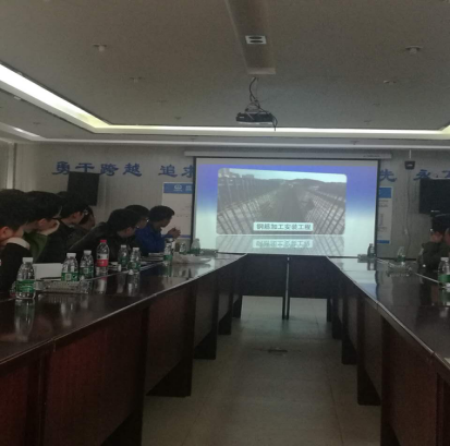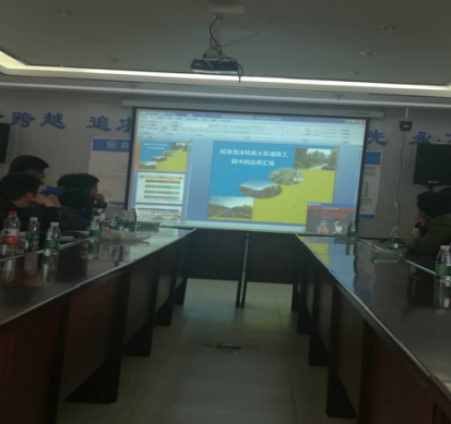 現場聽取介紹昌九快速路工程概況以及目前的施工技術特點、難點及進展情況;現場觀看了從泡沫混泥土施工工藝、大型橋梁的梁片、張拉、運輸、架梁等方面的效果視頻及深入細致的講解,工程的體量和技術難度讓人震撼。大家在認真觀看視頻后,不時地提出問題請教,項目總監(jiān)都一一進行了解答。